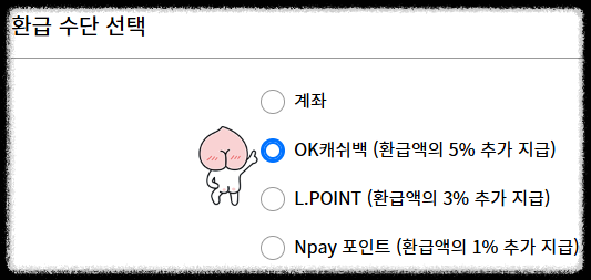 현금 대신 OK캐쉬백 포인트로 환급을 선택하면, 기본 10% 환급 금액 외에 추가로 5%의 포인트를 더 받을 수 있습니다!