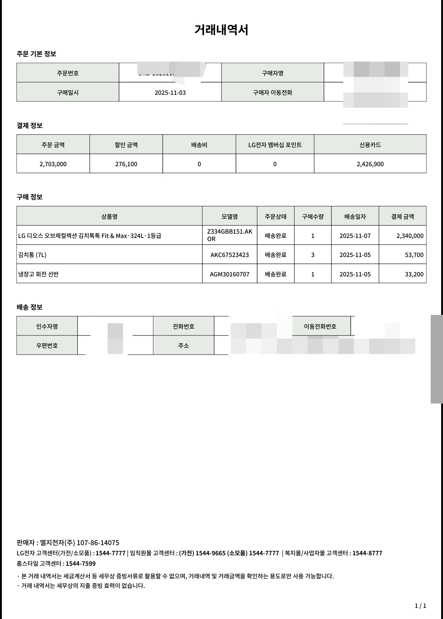 냉장고와 추가로 구입한 김치통이 포함된 영수증입니다만 냉장고 값만 신청하고 환급받았습니다.