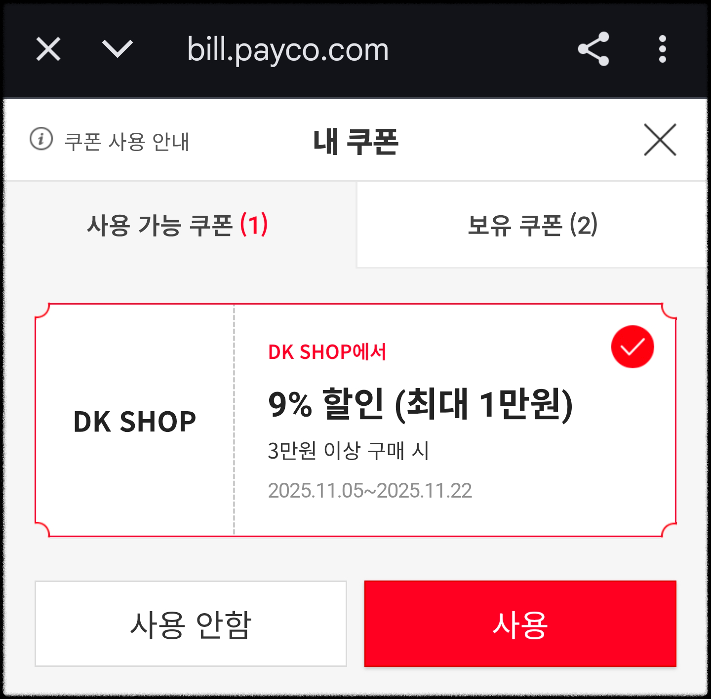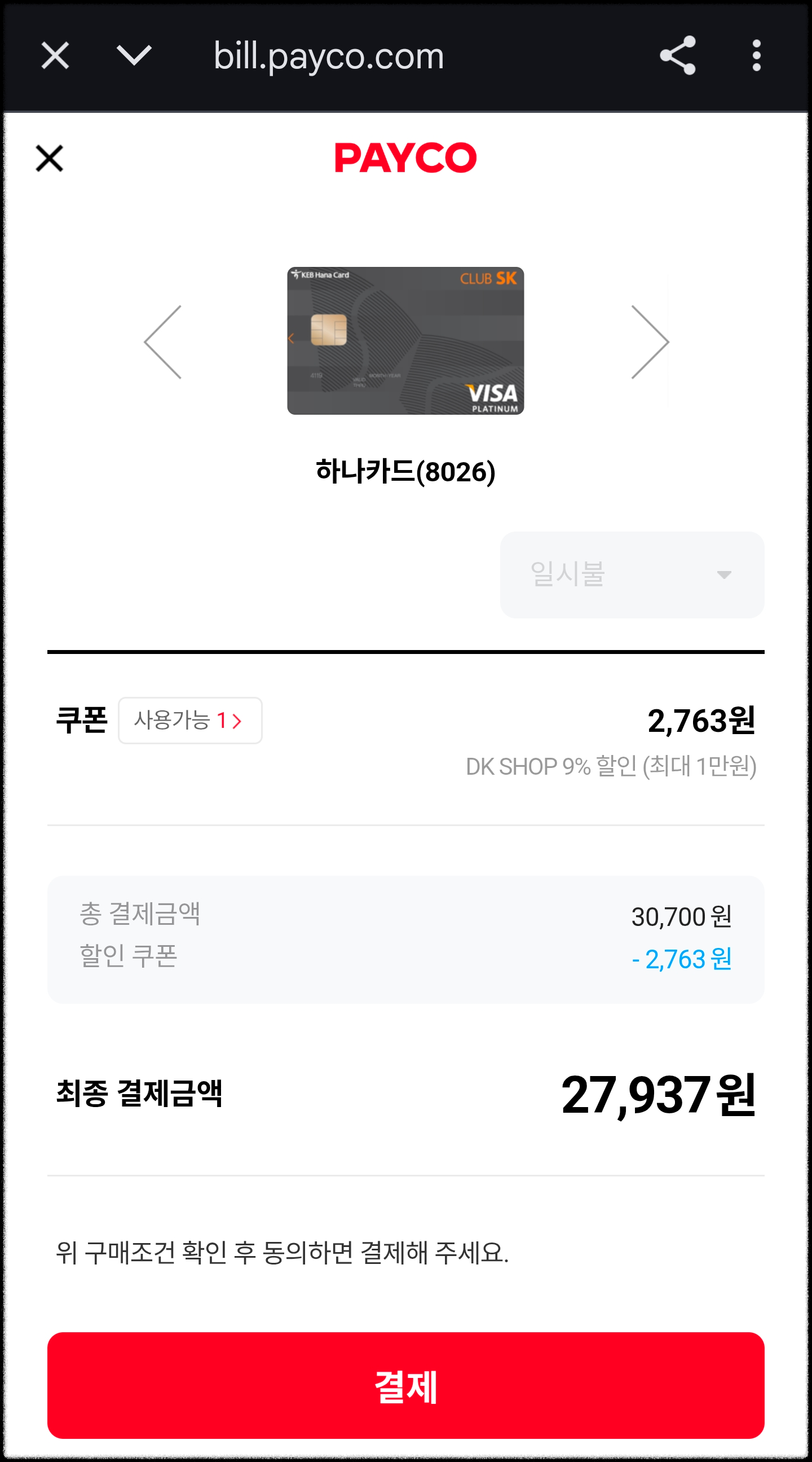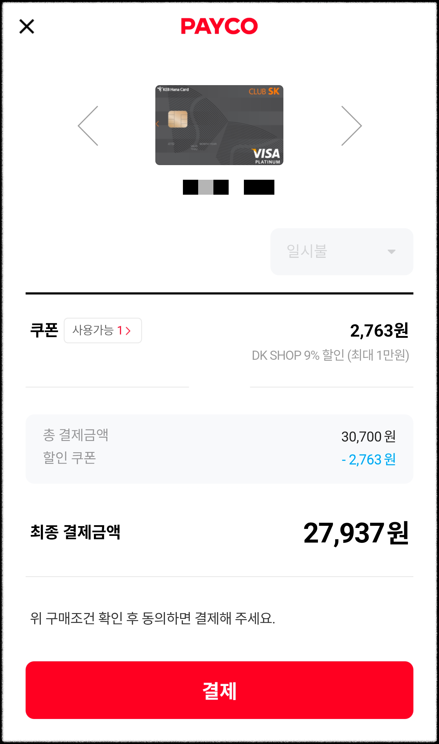 - 페이코 결제: 결제 시 페이코를 선택하여 최종 9% 추가 할인이 적용되었는지 확인 후 결제를 완료합니다.
