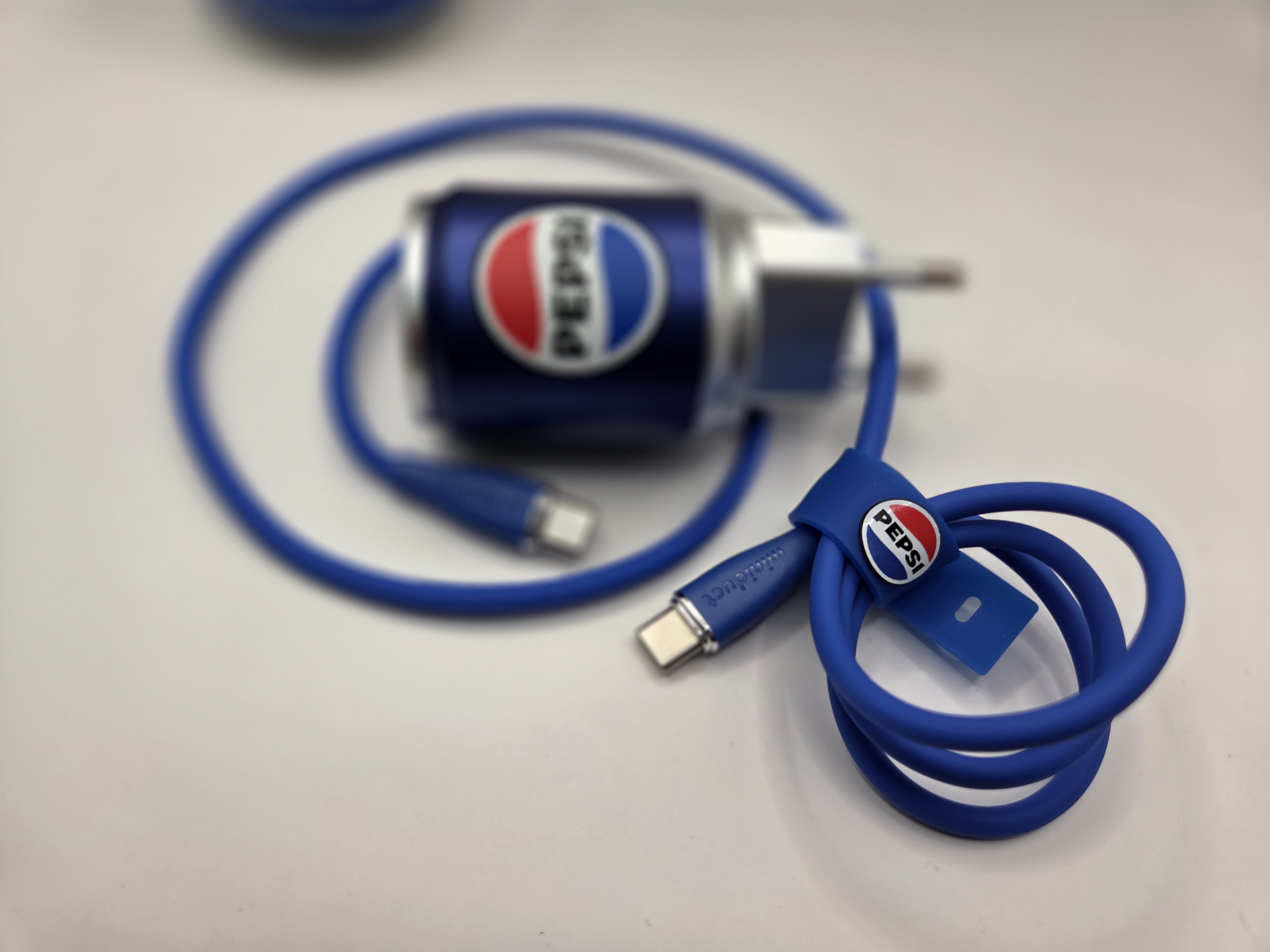 - 감성 시너지: 실버 맥북 옆에 놓인 파란색 펩시 충전기와 함께 들어있는 전용 블루 직조 케이블의 조합! 자칫 딱딱해 보일 수 있는 작업 공간을 '드립 카페' 같은 감성적인 공간으로 변신시켜 줍니다.